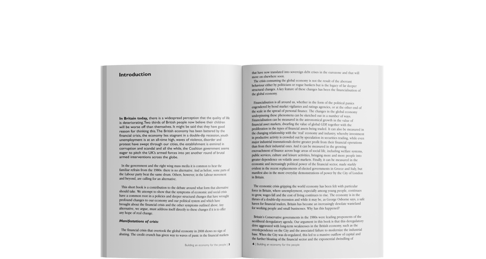 Building and economy for the people shows that the symptoms of economic and social crisis have a common root in the consensus policies of neo liberalism. Deep structural changes have wrought profound changes to Britain's economy and the global economy. The political system which brought about the 2008 financial crisis and today's crisis economy can only be tackled with policiesd which put people before profit..